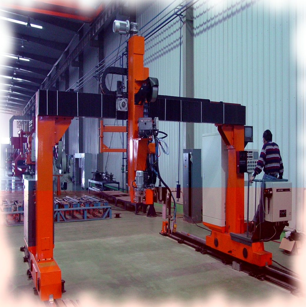 ● 龙门所配二台焊机、保护气气瓶(至少2个)、控制柜等均放在龙门两侧托架上,随龙门一起移动,进龙门的外部供电线缆采用滑线供给,使得龙门移动范围加大。